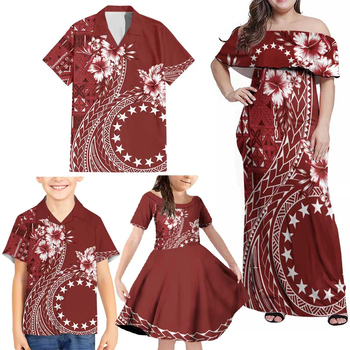 2025 logotipo personalizado familia Polinesia a juego fuera del hombro Maxi vestido y camisa celebración de la isla del Pacífico conjunto familiar bajo MOQ
