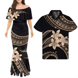 Tapa Hoa Couple Phù Hợp Với Trang Phục Polynesian Mô Hình Phụ Nữ Thanh Lịch Tắt Vai Dresses Người Đàn Ông Của Áo Sơ Mi Thiết Lập